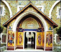 Il Monastero della Panaghía di Kykkos trae il suo nome dal monte omonimo, nel massiccio montagnoso detto Troodos, sul quale è costruito. La sua fondazione si fa risalire alla fine del secolo XI, ad opera di un monaco di nome Isaia, che ne fu anche il primo igumeno (abate). Il Monastero conobbe durante la sua lunga storia una grande prosperità e fu centro di intensa vita spirituale e liturgica. Durante l'occupazione turca dell'Isola ebbe molto a patire e molti dei suoi Monaci furono uccisi ed i loro beni sequestrati, dispersi o incendiati. Alcuni di loro divennero Vescovi e Arcivescovi. Fra i più celebri spicca nel secolo XII Neofito, soprannominato il Recluso, definito il Crisostomo di Cipro, per la bellezza dei suoi scritti, fra i quali omelie sulla Madre di Dio; in tempi più recenti spicca il nome dell'Arcivescovo Makarios che vi fu monaco prima di divenire Arcivescovo ed etnarca [cioè, Capo di Stato]. L’interno della Chiesa del Monastero ha di che stupire il visitatore. La sua forma che imita una L, è costituita in pratica da due diverse chiese giustapposte, la prima in forma basilicale allungata, la seconda in croce greca centrata. L’interno comporta una immensa iconostasi che, per l’irregolarità della pianta, non è visibile nella sua interezza dalla navata. La decorazione della Chiesa è di una ricchezza incredibile, a cominciare dai lustri, candelabri tutti diversi e sontuosi, alcuni dei quali hanno la forma della Basilica di Santa Sofia di Costantinopoli; e dappertutto ori e volute d’incenso. Il tutto lascia nell’animo di chi vi entra una sensazione indefinibile di pace e di profonda spiritualità.